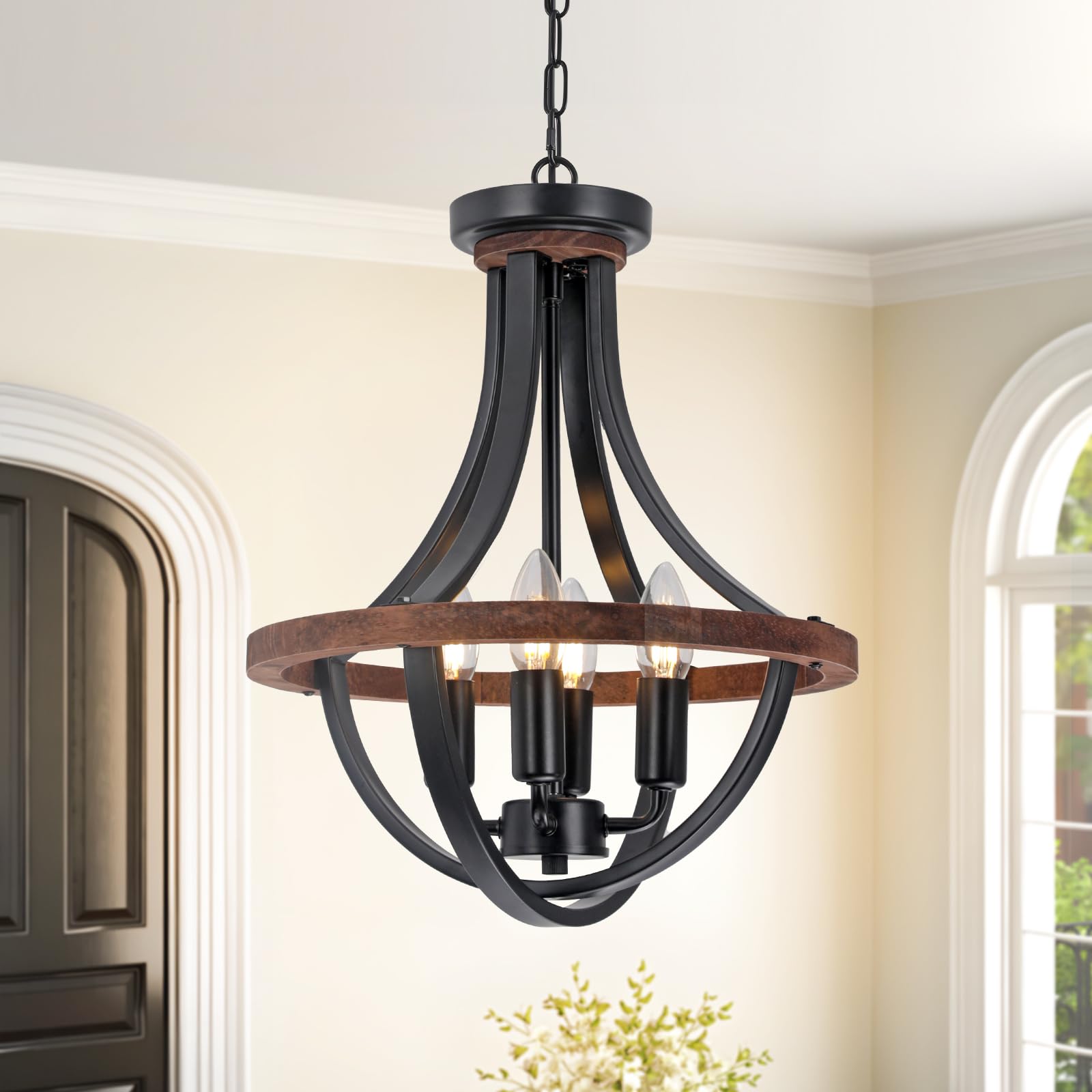 The SEEBLEN Farmhouse Wood Chandelier blends wood and metal to create a cozy, country look. You can change the chain length to hang it low or keep it flush with the ceiling. This makes it flexible for different spaces like dining rooms or hallways.