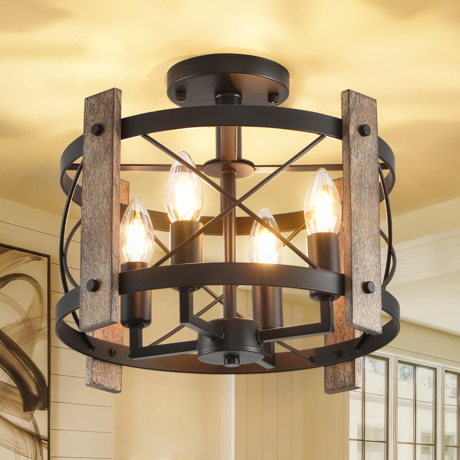 This light has a clean, rustic look with a wood and metal frame. You can use it in kitchens, hallways, or living rooms to add a farmhouse style without too much fuss.
