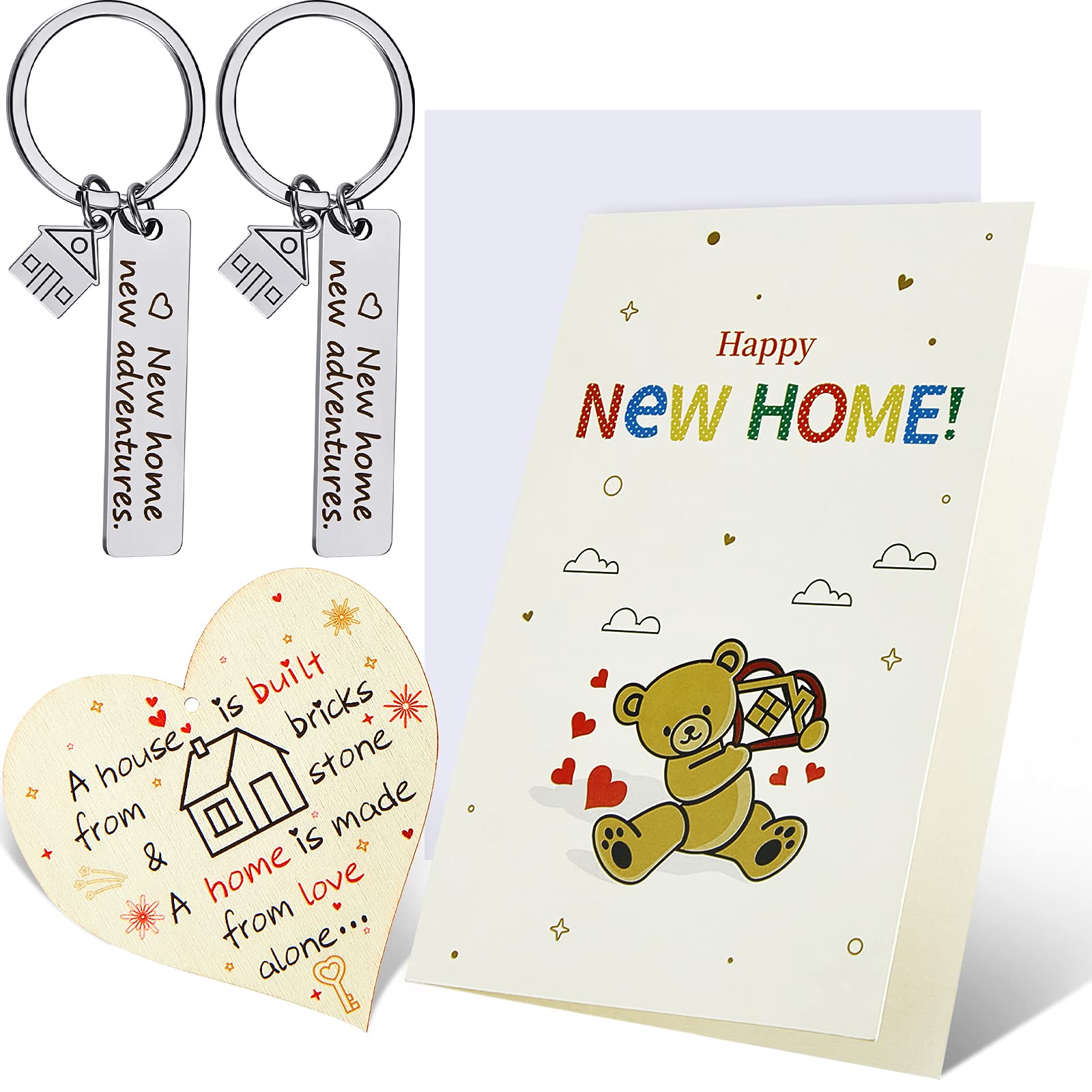 You get two keychains that say “New Home New Adventures,” a sweet wooden heart plaque to hang, and a card with envelope all in one set. This variety helps you show you care in different ways, with both keepsakes and something practical.